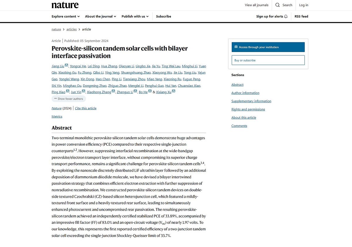 Vertically integrated solar manufacturer LONGi Green Energy has published a research paper titled “Perovskite-silicon tandem solar cells with bilayer interface passivation” in the science journal Nature. The study reveals breakthroughs in tandem solar cell technology that surpass the efficiency limits of single-junction solar cells. LONGi developed a patented technology featuring an asymmetrical textured silicon heterojunction (HJT) solar cell. The front surface is micro-textured to facilitate the solution-based fabrication of perovskite layers, while the back surface features standard large textures to improve rear-side passivation and infrared response. This innovation led to a record-breaking 33.9% certified conversion efficiency for the perovskite/silicon tandem cell. LONGi says that this is the first time in solar cell history that tandem cell efficiency has experimentally exceeded the Shockley-Queisser (S-Q) theoretical limit for single-junction cells.