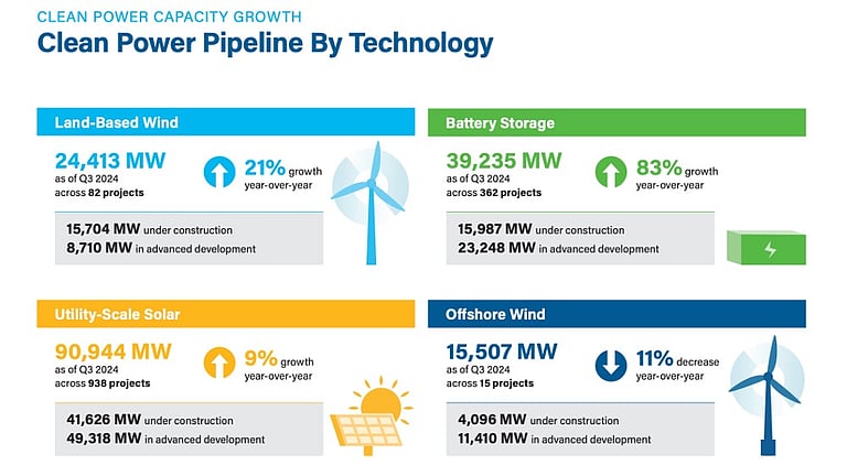 At the end of the reporting quarter, ACP’s Clean Power Quarterly Market Report Q3 2024 counts the country’s clean power project pipeline at over 170.1 GW, representing an 18% YoY increase, thanks mainly to the steady growth of battery storage and solar. Over the last 3 years, the pipeline of both these technologies has expanded by 286% and 53%, respectively.
