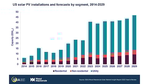 Analysts forecast residential installations to decline by 19% YoY this year with the California market alone dropping by 41% compared to 2023. California made up 30% of the residential solar market last year. Recovery is expected from 2025 onwards, yet the AD/CDV tariffs are likely to impact this growth. In 2025, it will grow by 14% and add over 33 GW DC between 2026 and 2029 as retail electricity rates go up and emerging markets grow.